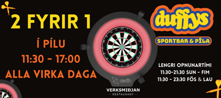 Verksmiðjan býður upp á 2 fyrir 1 í pílu. Tilboðið gildir alla virka daga, frá klukkan 11:30 - 17:00.